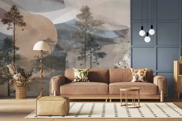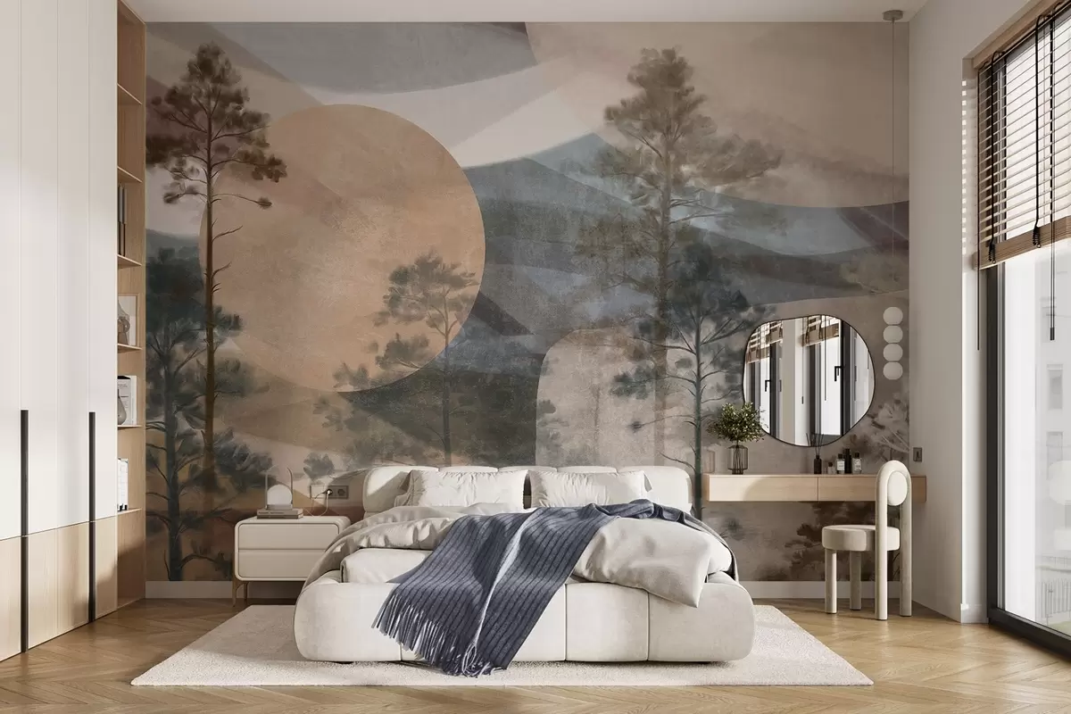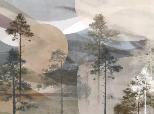 Papier peint De grands pins dans un paysage aux textures discrètes, avec des formes circulaires abstraites et des montagnes superposées dans des tons ocres. N° w09636