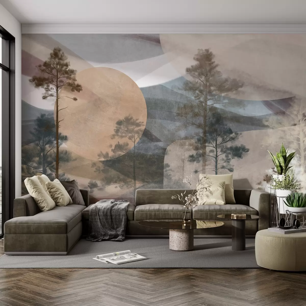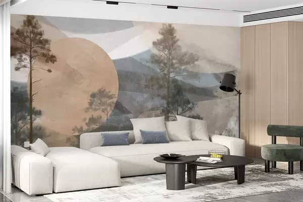 Papier peint De grands pins dans un paysage aux textures discrètes, avec des formes circulaires abstraites et des montagnes superposées dans des tons ocres. N° w09636
