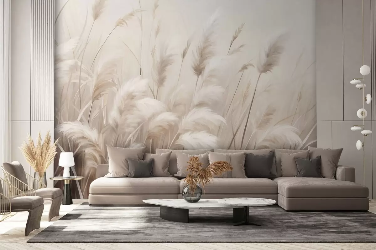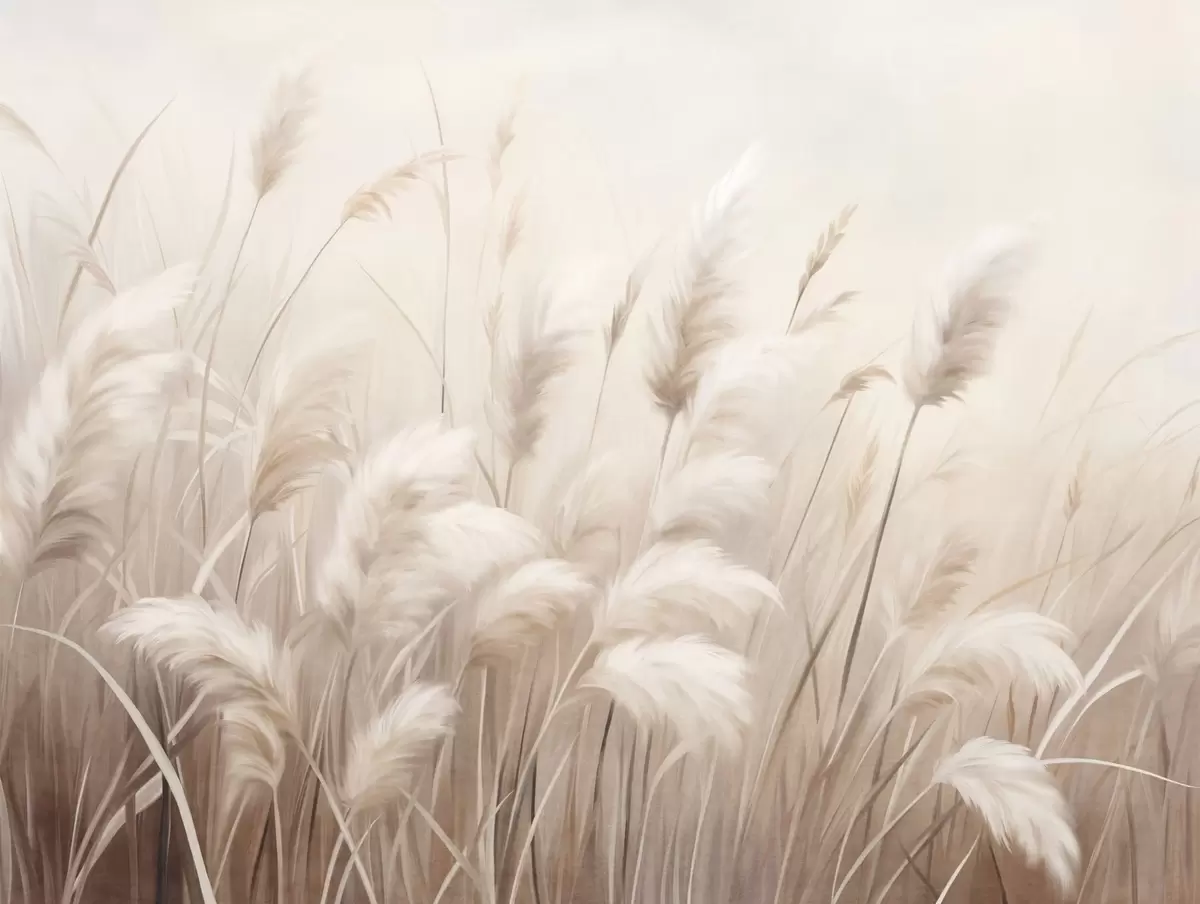 Papier peint Hautes herbes de pampa texturées dans des tons doux, chauds et neutres, avec un arrière-plan flou et clair. N° w09637