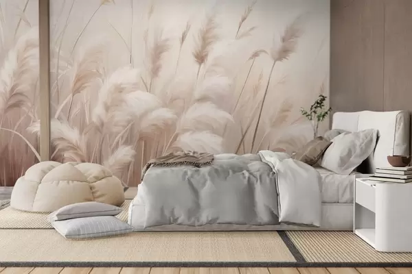 Papier peint Hautes herbes de pampa texturées dans des tons doux, chauds et neutres, avec un arrière-plan flou et clair. N° w09637