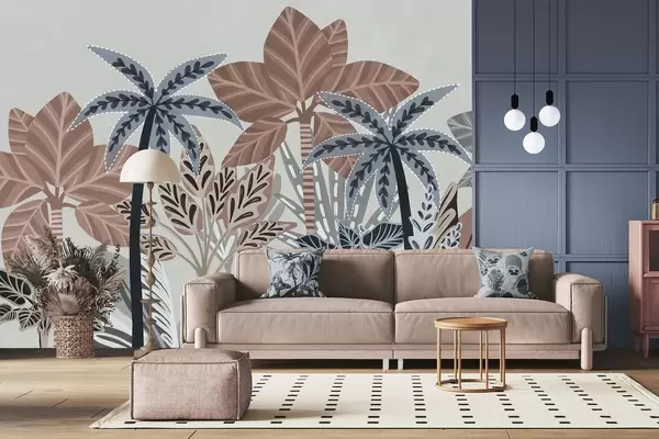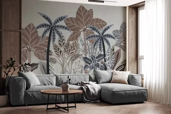 Papier peint Plantes tropicales texturées et palmiers aux couleurs douces dans un style bohème décoratif sur fond gris N° w09639v1