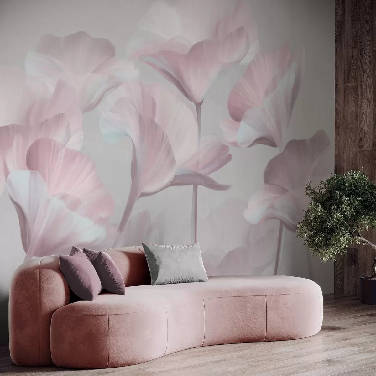 Papier peint Fleurs de lotus translucides texturées rose pâle aux pétales délicats sur fond gris discret N° w09640v1
