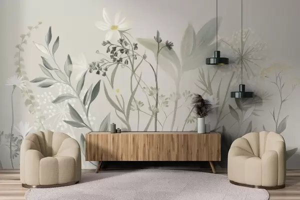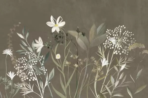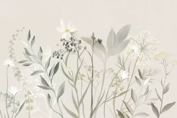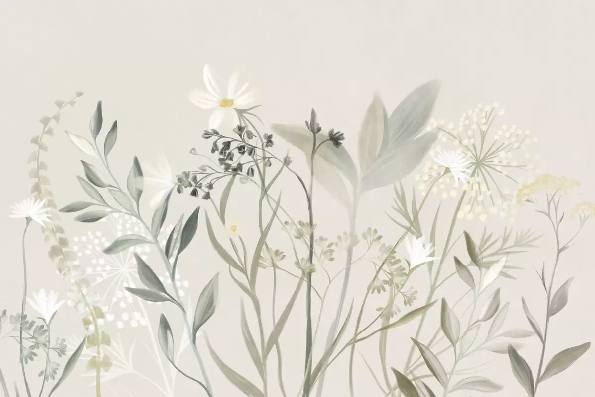 Papier peint Fleurs sauvages et feuillage délicatement texturés dans des tons verts et crème discrets sur un fond beige clair. N° w09641