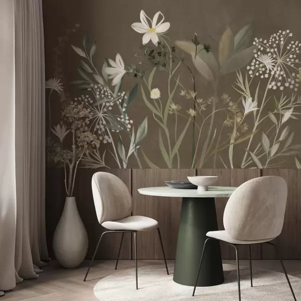 Papier peint Fleurs sauvages et feuillage délicatement texturés dans des tons verts et crème discrets sur fond brun. N° w09641v1