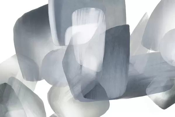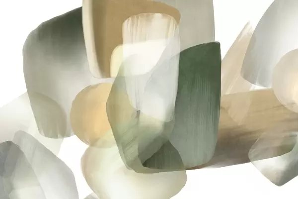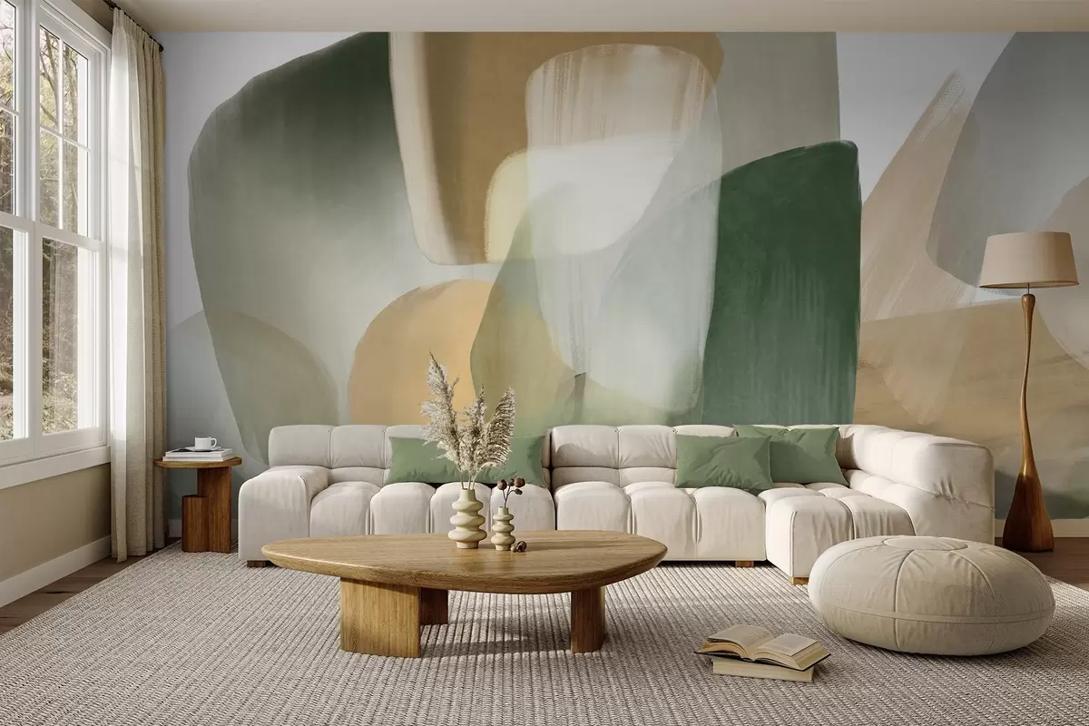 Papier peint Formes abstraites texturées dans des tons verts et beiges discrets, aux contours flous et aux couches superposées. N° w09642