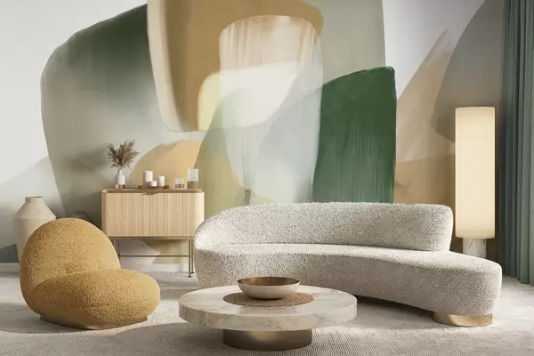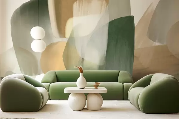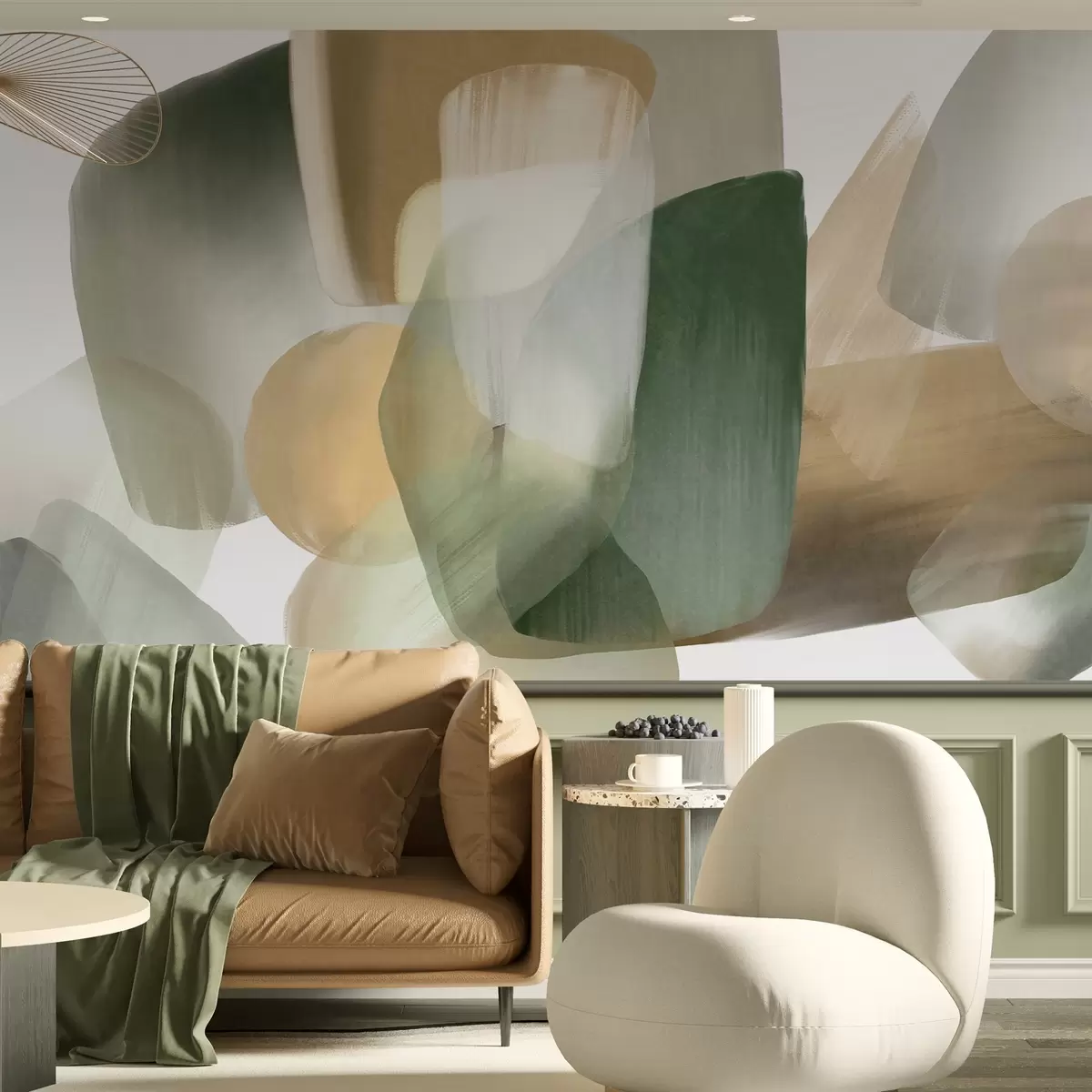 Papier peint Formes abstraites texturées dans des tons verts et beiges discrets, aux contours flous et aux couches superposées. N° w09642