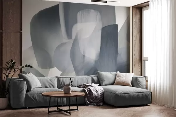 Papier peint Formes abstraites texturées dans des tons bleus et gris discrets, aux contours flous et aux couches superposées. N° w09642v1