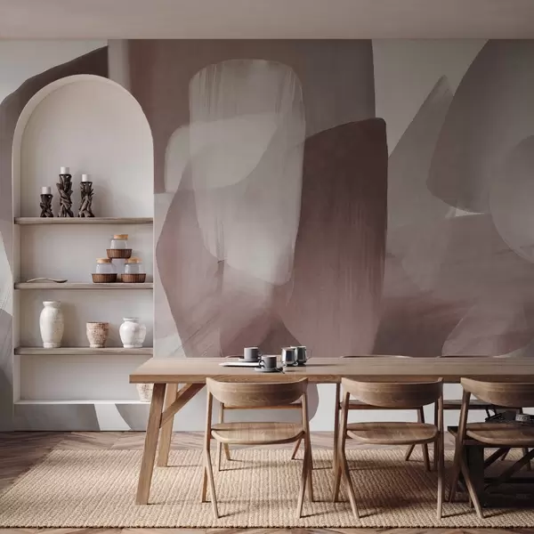 Papier peint Formes abstraites texturées dans des tons bordeaux et gris discrets, aux contours flous et aux couches superposées. N° w09642v2