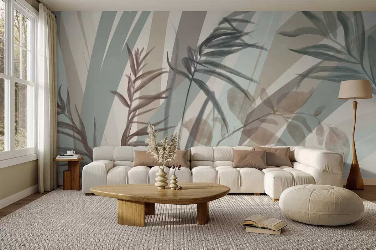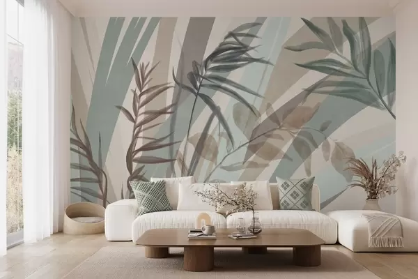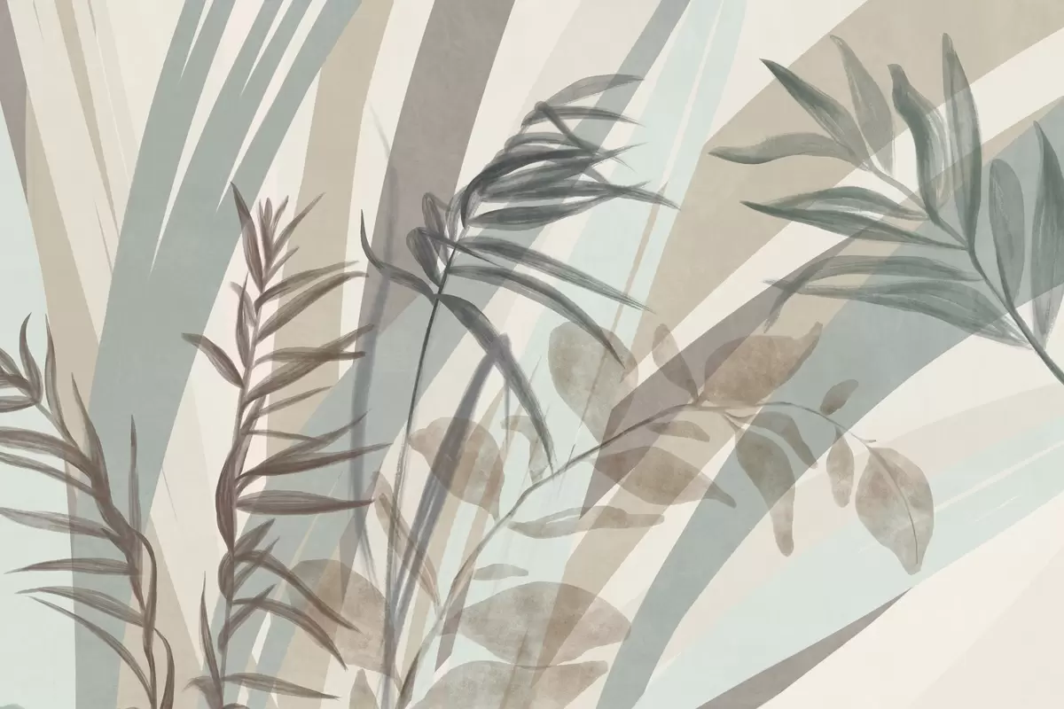 Papier peint Hautes herbes texturées et feuilles dans des tons terreux discrets, avec des lignes abstraites en arrière-plan, créant un imprimé organique. N° w09643