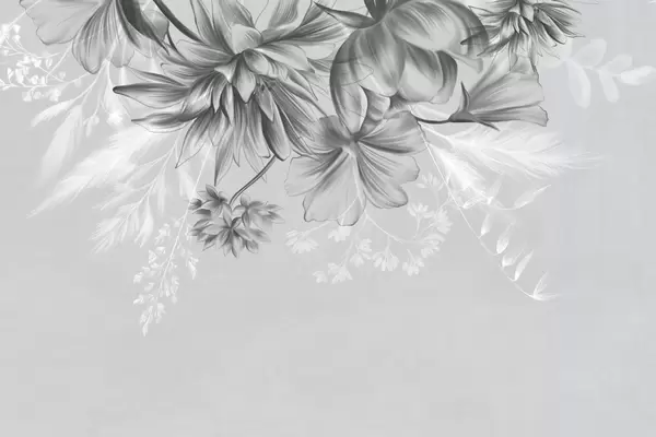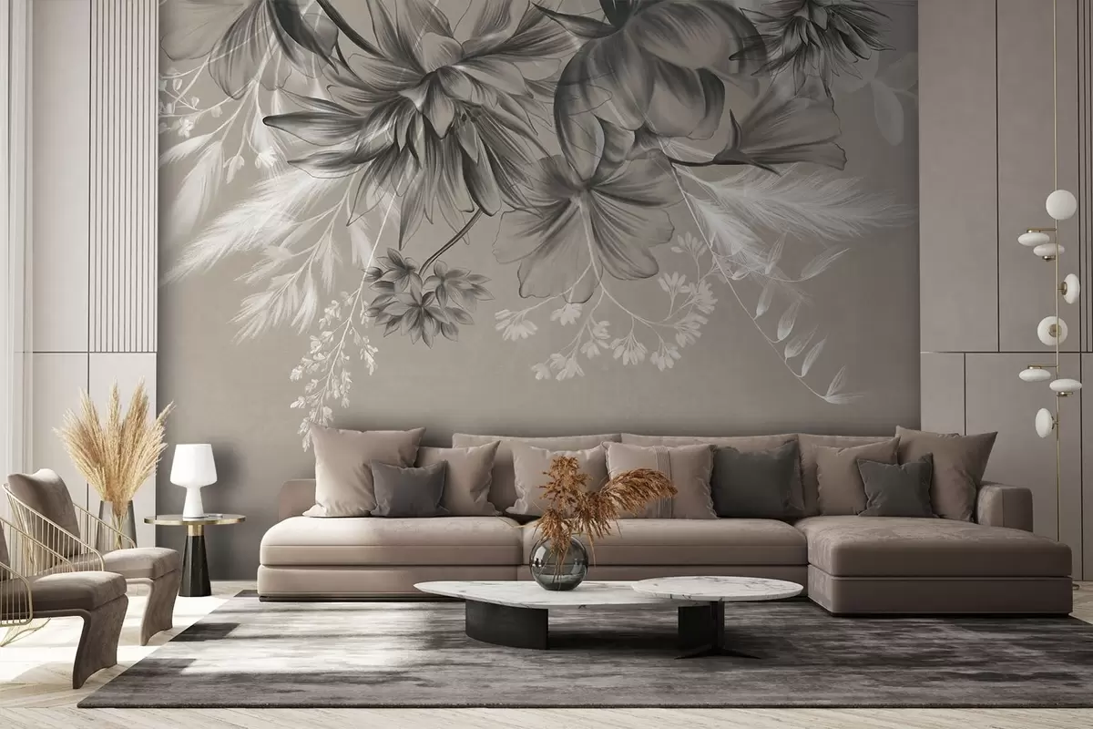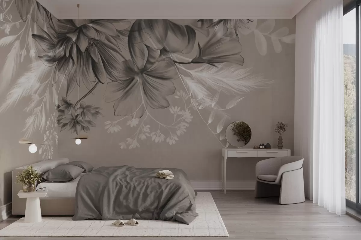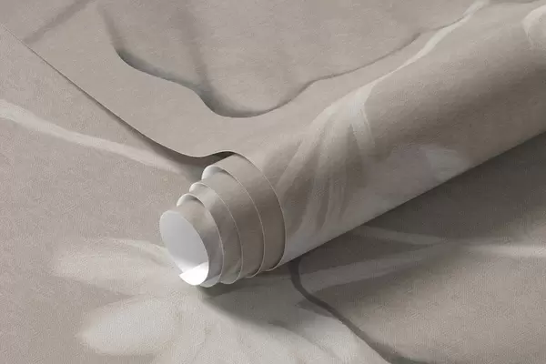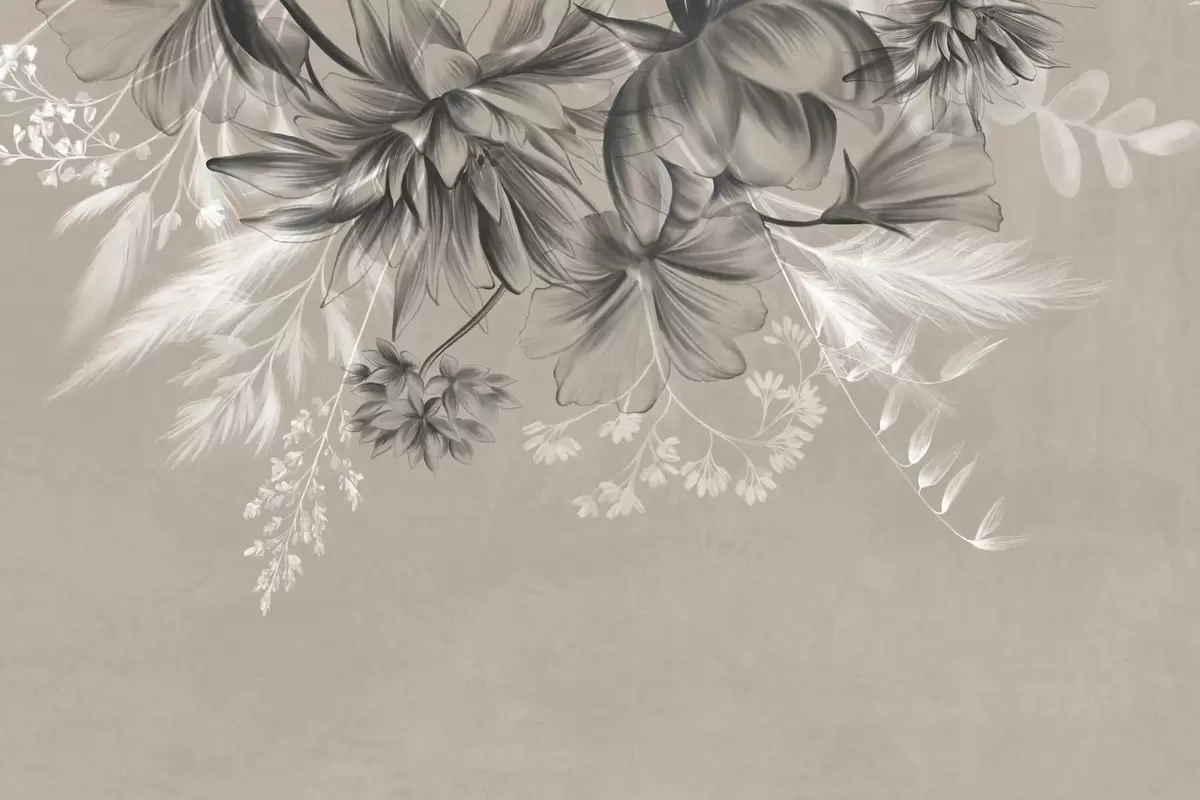 Papier peint Fleurs et fougères texturées dans des tons gris foncé et blanc sur un fond beige discret, style dessin N° w09644