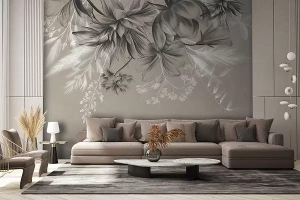 Papier peint Fleurs et fougères texturées dans des tons gris foncé et blanc sur un fond beige discret, style dessin N° w09644