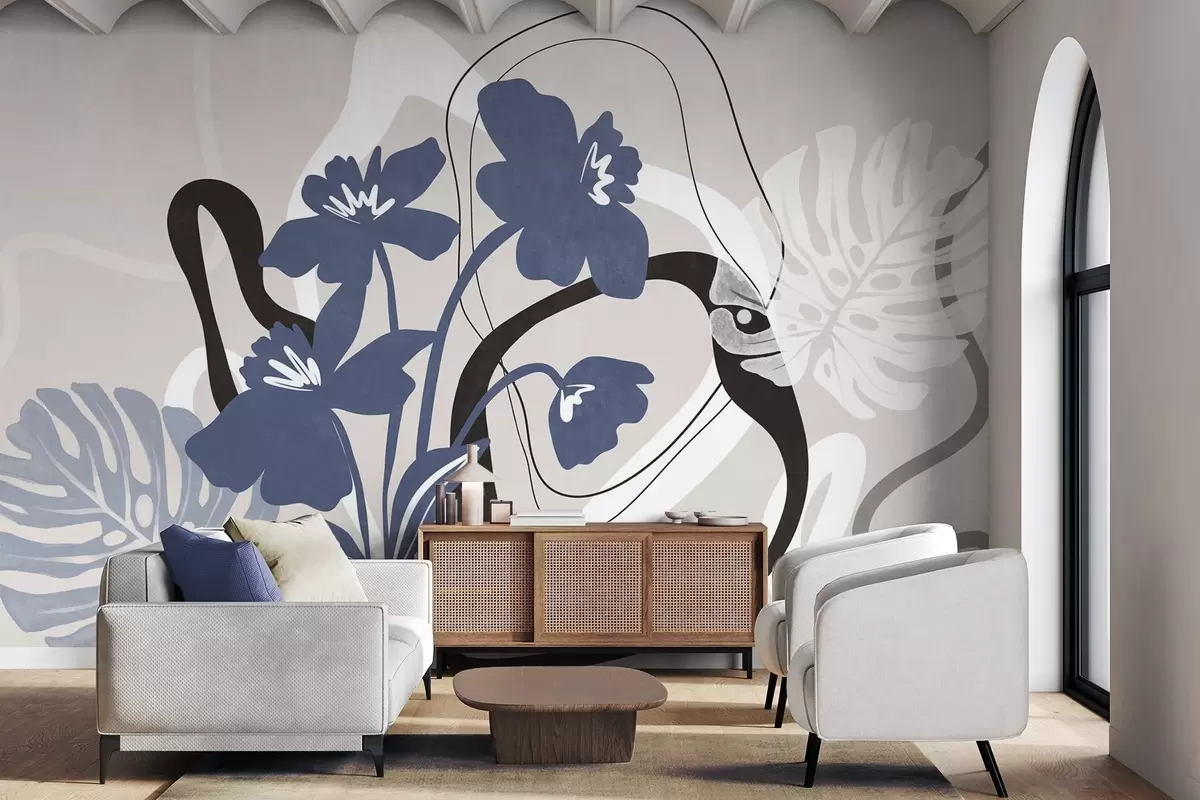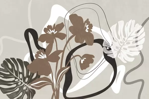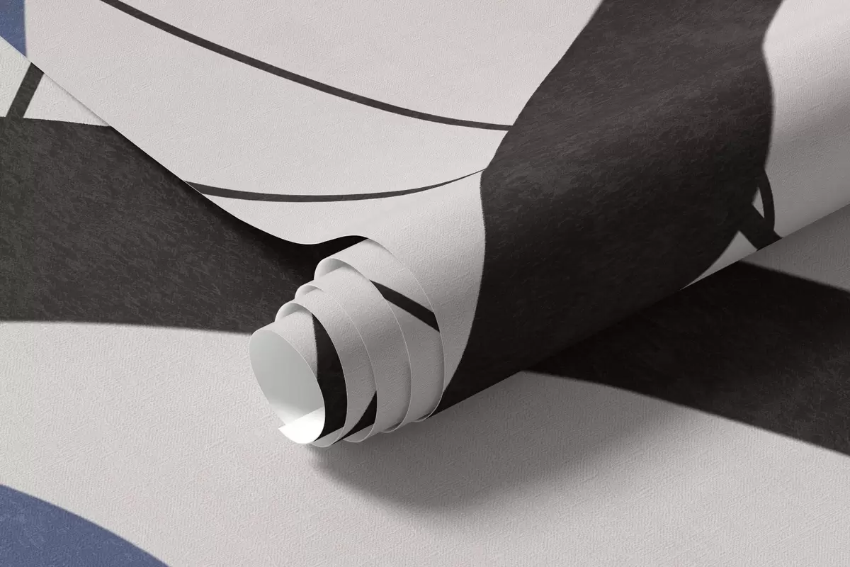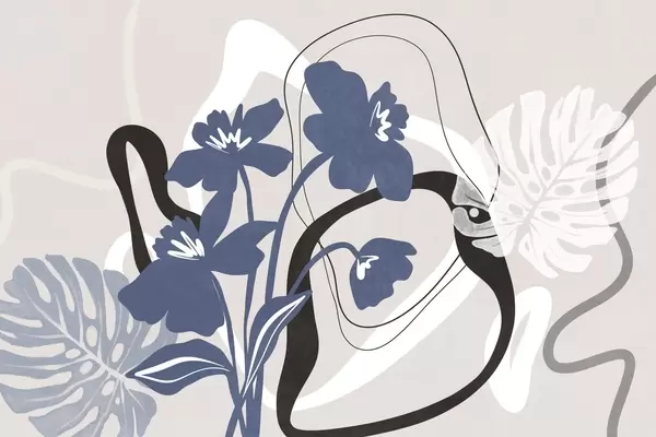 Papier peint Fleurs bleues abstraites texturées avec des formes blanches et noires sur fond beige clair, art minimaliste N° w09645