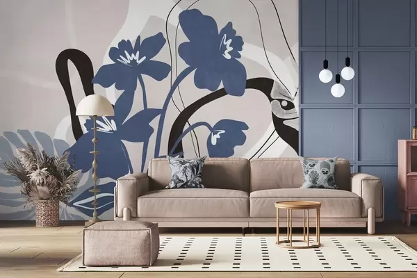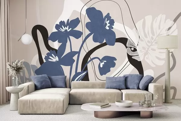 Papier peint Fleurs bleues abstraites texturées avec des formes blanches et noires sur fond beige clair, art minimaliste N° w09645