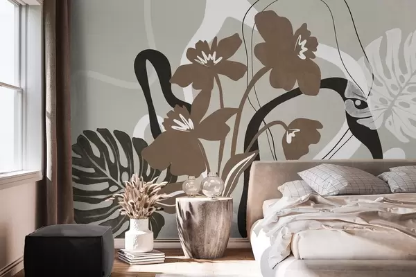 Papier peint Fleurs brunes abstraites texturées avec des formes blanches et noires sur fond beige, art minimaliste N° w09645v1