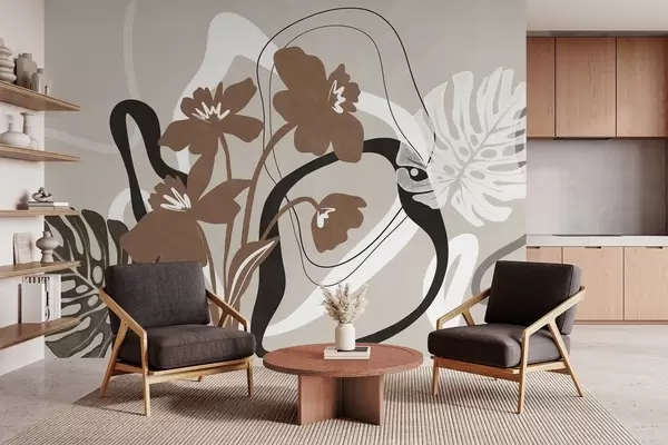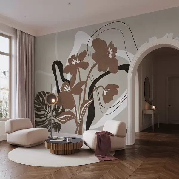 Papier peint Fleurs brunes abstraites texturées avec des formes blanches et noires sur fond beige, art minimaliste N° w09645v1