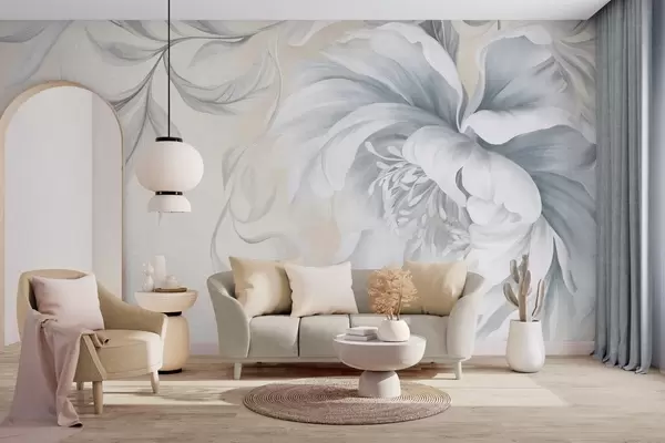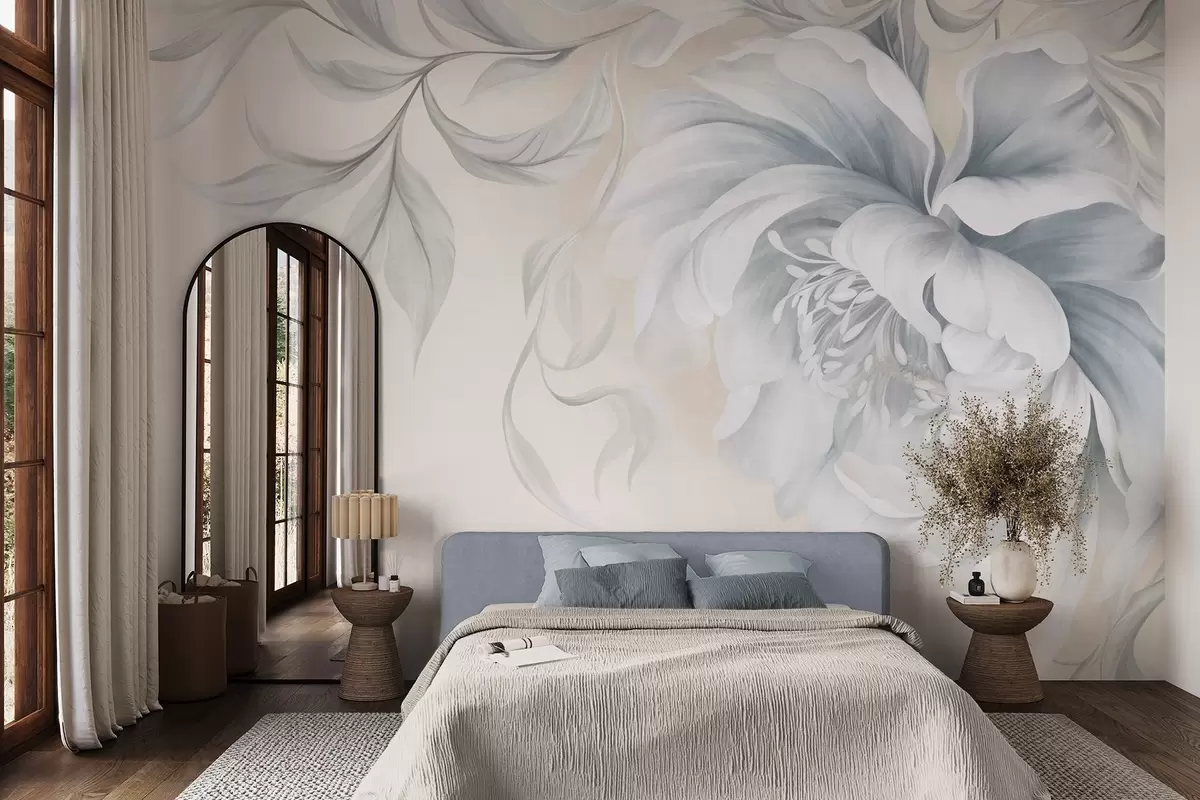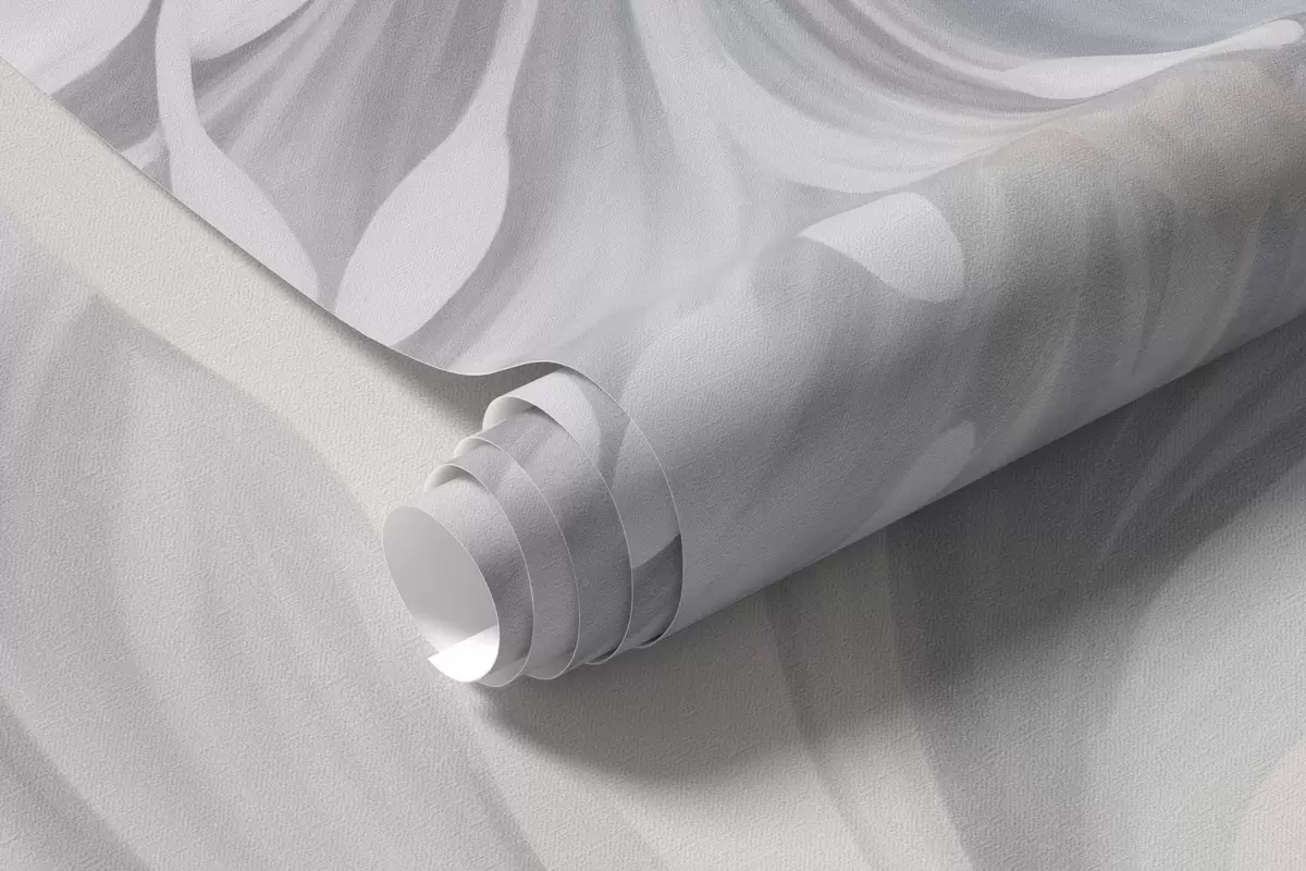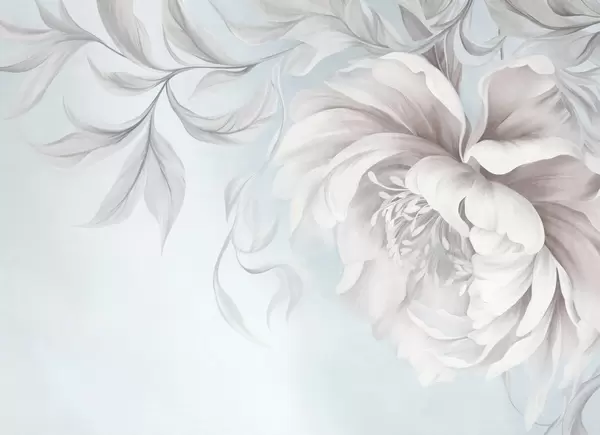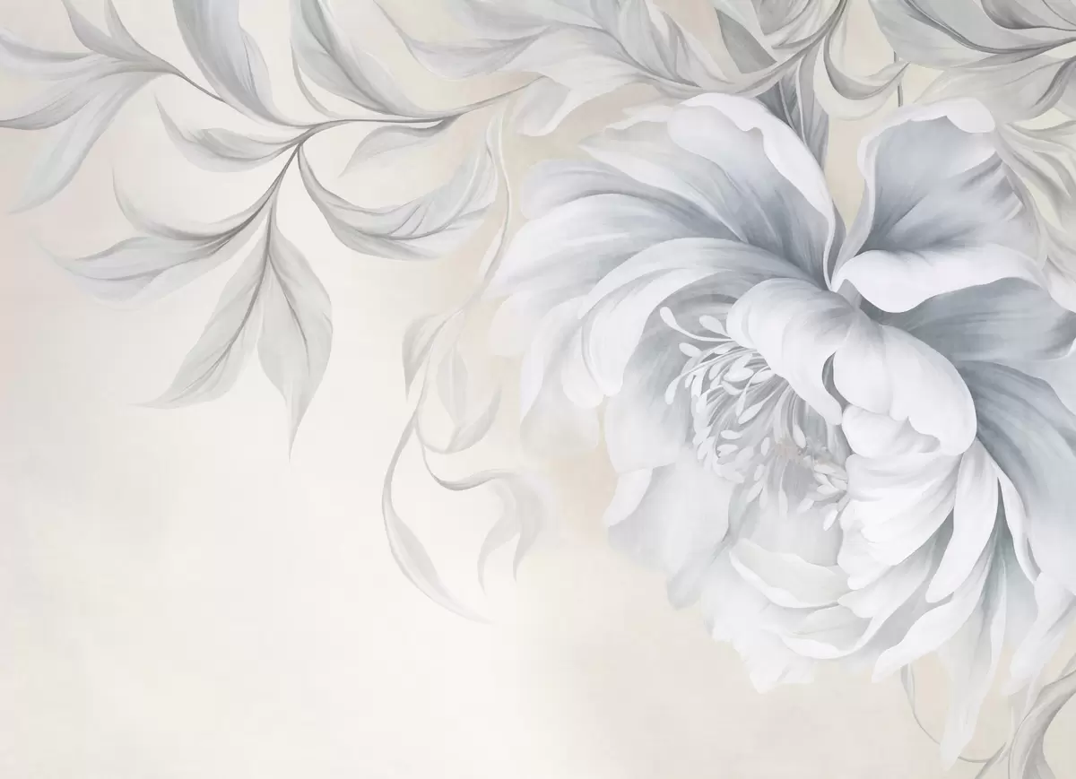 Papier peint Grande pivoine texturée aux pétales délicats et aux feuilles grises, peinte dans un style doux N° w09647