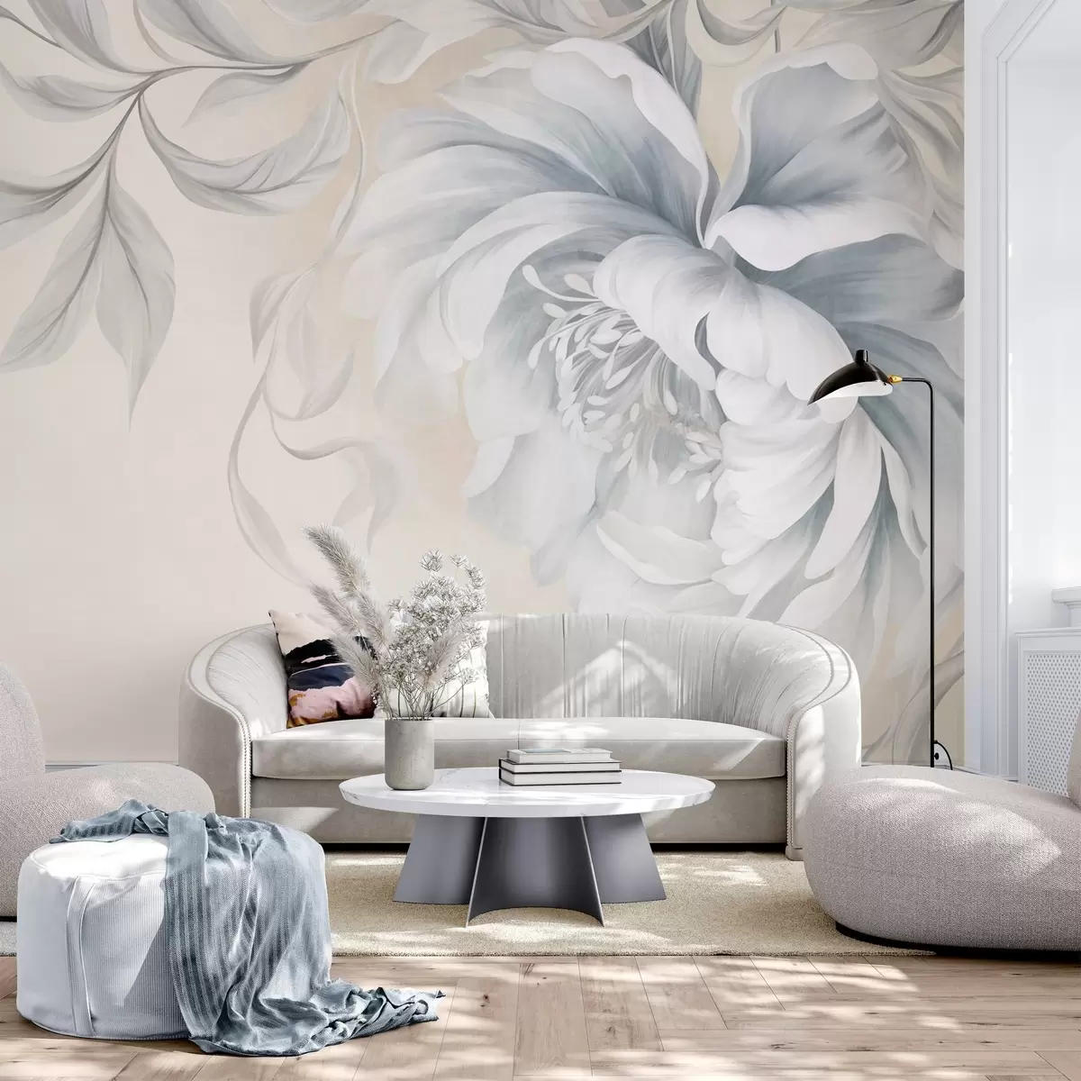 Papier peint Grande pivoine texturée aux pétales délicats et aux feuilles grises, peinte dans un style doux N° w09647