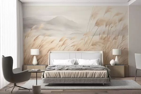 Papier peint Paysage montagneux texturé avec de hautes herbes sèches sous un ciel brumeux N° w09649