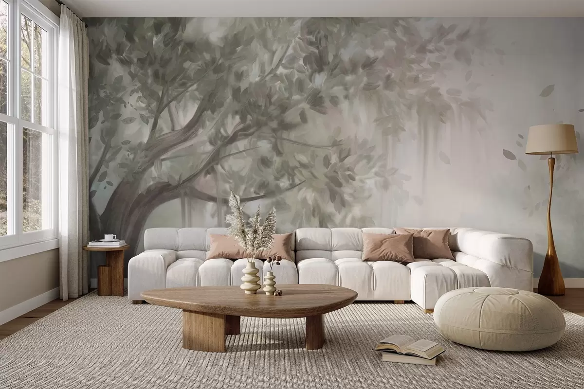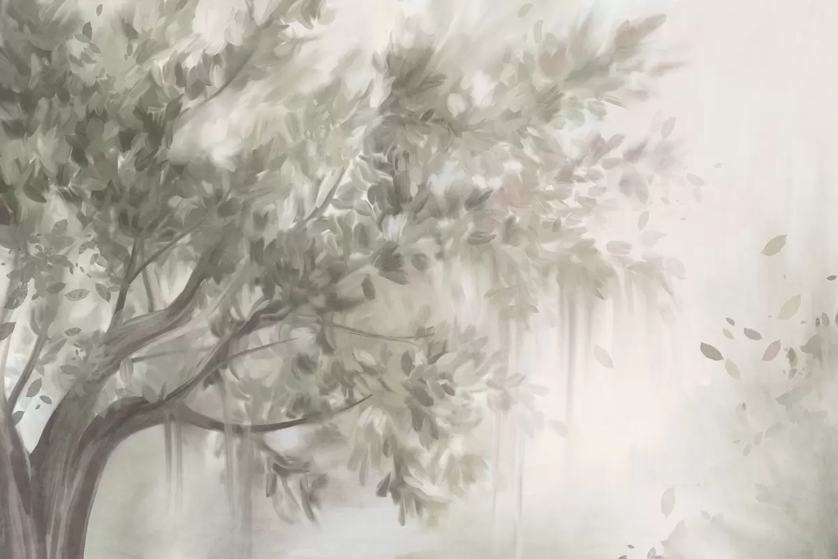 Papier peint Arbre texturé avec des feuilles et des branches vert clair, sur un fond doux et flou N° w09650