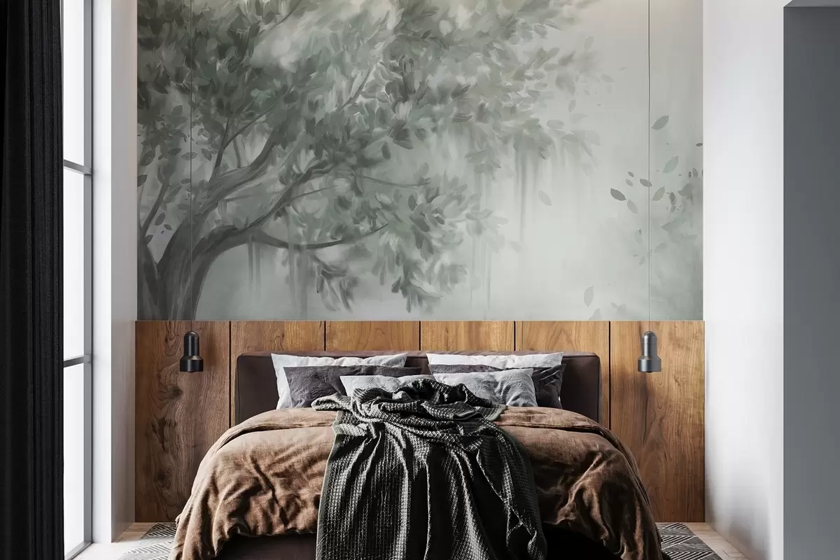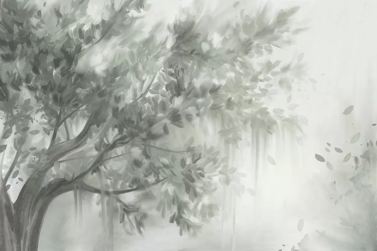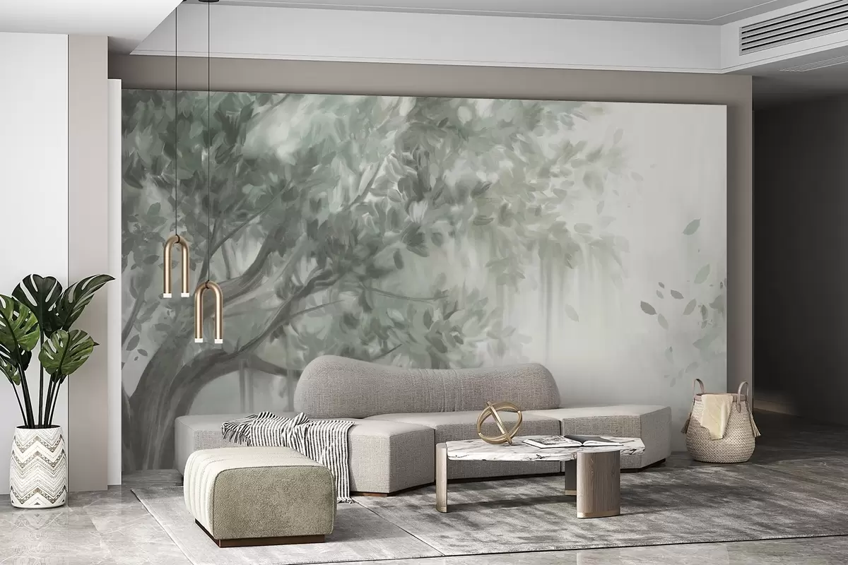 Papier peint Arbre texturé avec des feuilles et des branches vertes, sur un fond doux et flou N° w09650v1