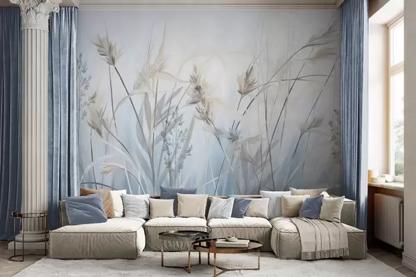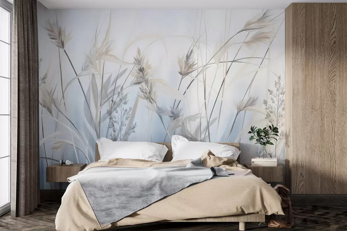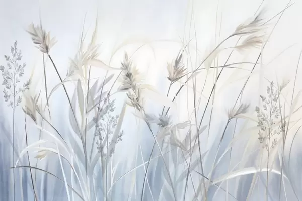 Papier peint Hauts brins d'herbe sèche aux sommets plumeux dans des tons sourds, fond bleu et blanc doux et brumeux N° w09652