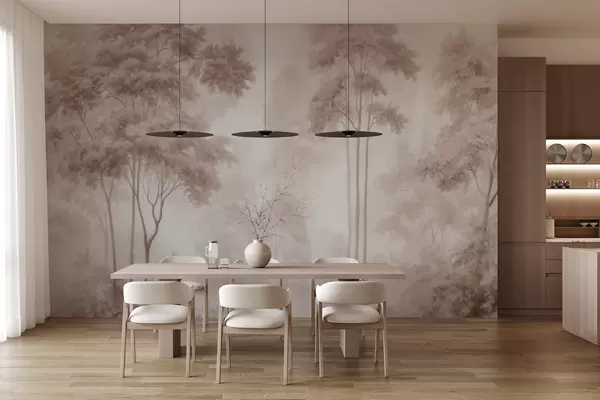 Papier peint Paysage forestier abstrait dans des tons beige fumé, créant une impression de profondeur N° w09657