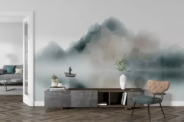 Papier peint Paysage de montagne avec un bateau et un pêcheur se fondant dans une brume légère N° w09678