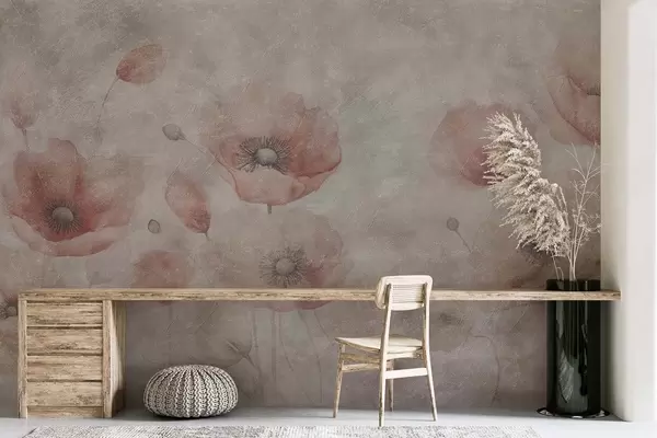 Papier peint Grandes fleurs de pavot sur un mur avec un effet antique N° w09686