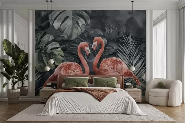 Papier peint Un couple de flamants roses parmi des plantes tropicales N° w09687