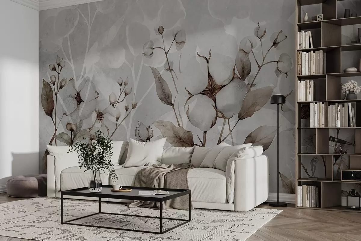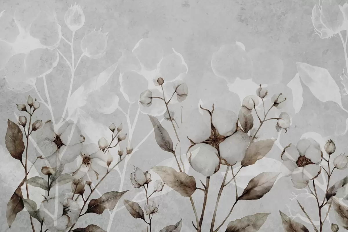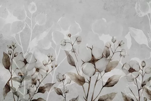 Papier peint Grandes fleurs de coton sur fond gris clair N° w09691