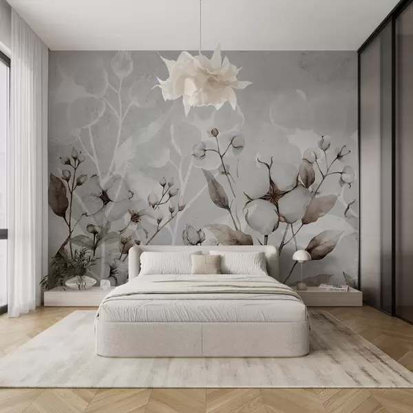 Papier peint Grandes fleurs de coton sur fond gris clair N° w09691