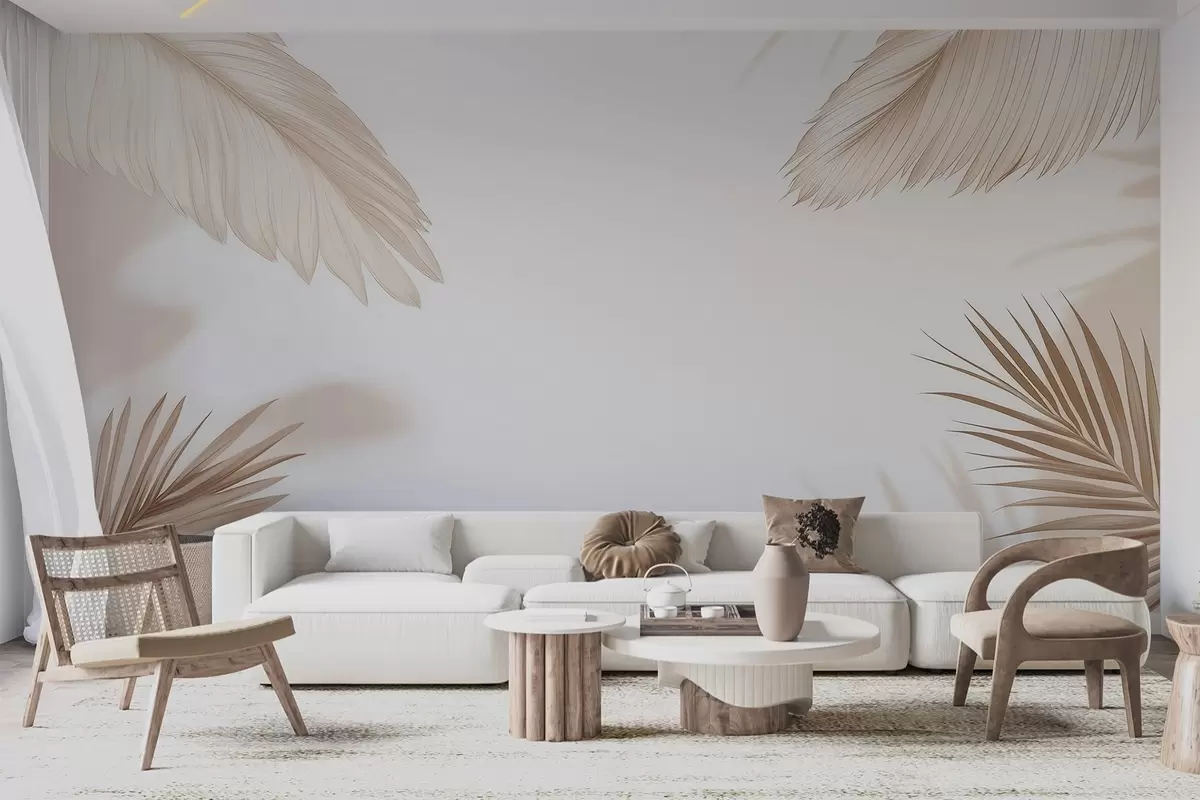 Papier peint Décor tropical dans les tons beiges, avec des silhouettes de feuilles de palmier et des ombres douces N° w09714