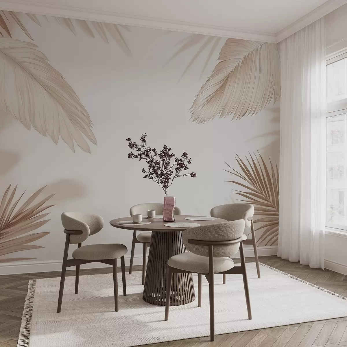 Papier peint Décor tropical dans les tons beiges, avec des silhouettes de feuilles de palmier et des ombres douces N° w09714