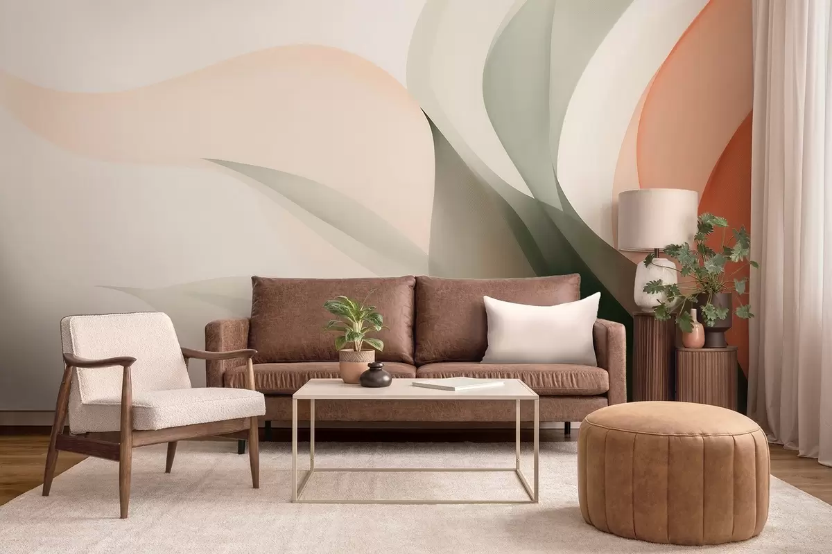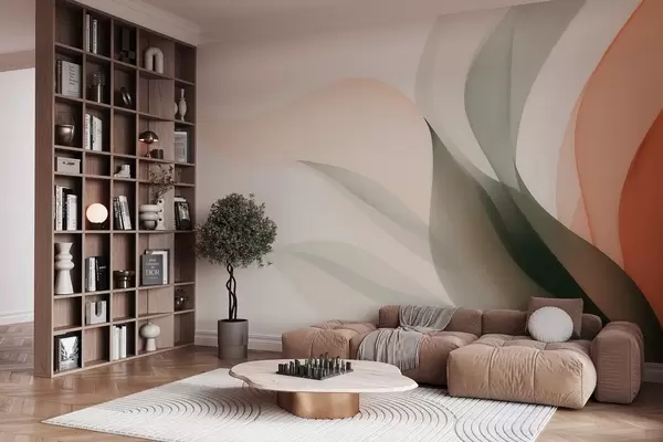 Papier peint Vagues abstraites aux tons orange et vert N° w09718