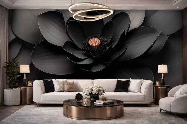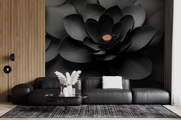 Papier peint Fleur noire minimaliste avec des pétales et un cœur aux tons chauds qui contraste N° w09721