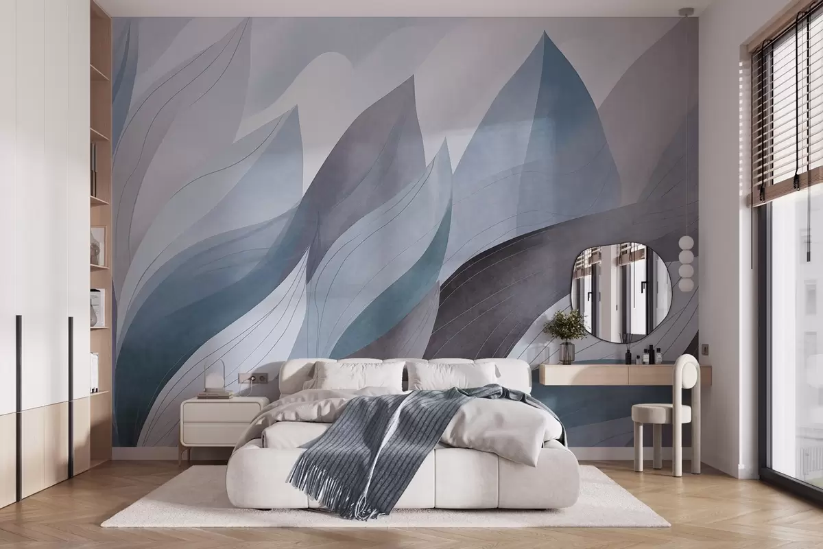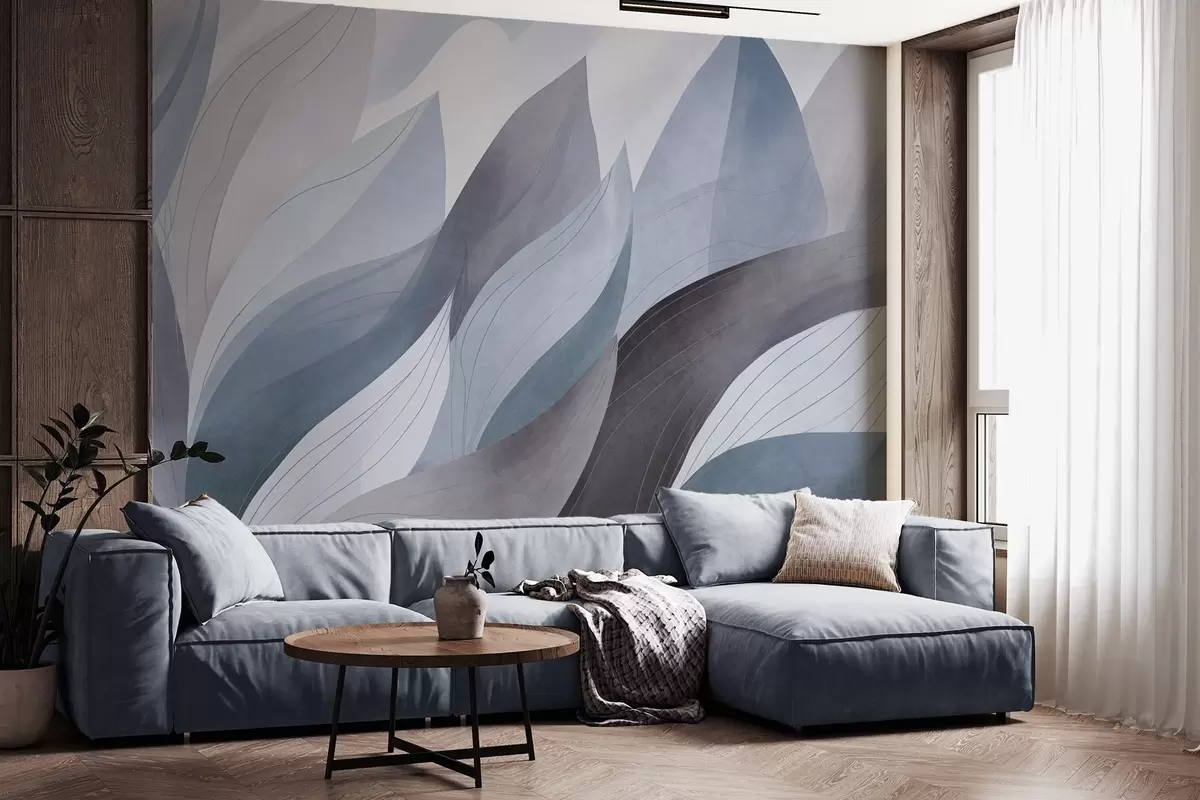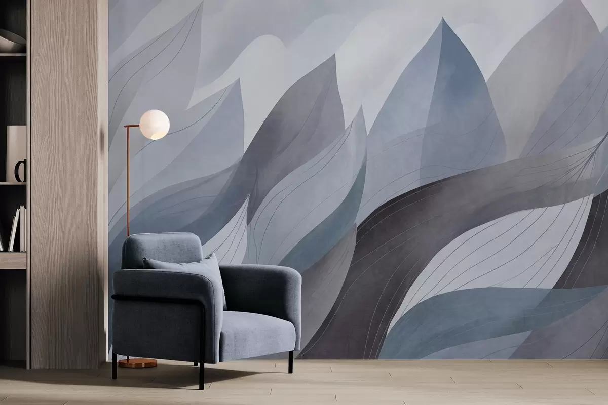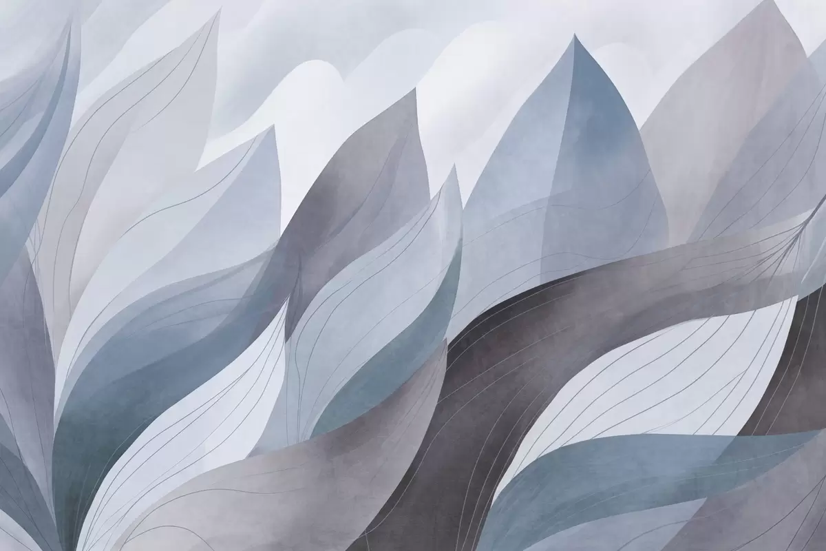 Papier peint Feuilles abstraites, tons terreux discrets de bleu avec des détails aux lignes délicates, texture douce de l'aquarelle. N° w09736v1