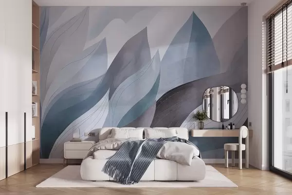 Papier peint Feuilles abstraites, tons terreux discrets de bleu avec des détails aux lignes délicates, texture douce de l'aquarelle. N° w09736v1