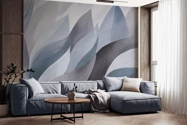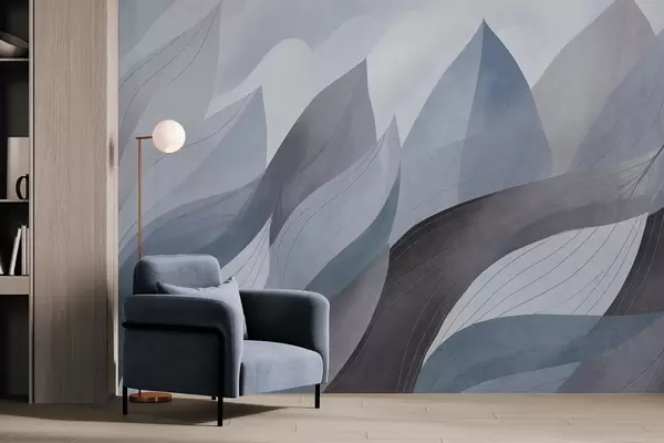 Papier peint Feuilles abstraites, tons terreux discrets de bleu avec des détails aux lignes délicates, texture douce de l'aquarelle. N° w09736v1