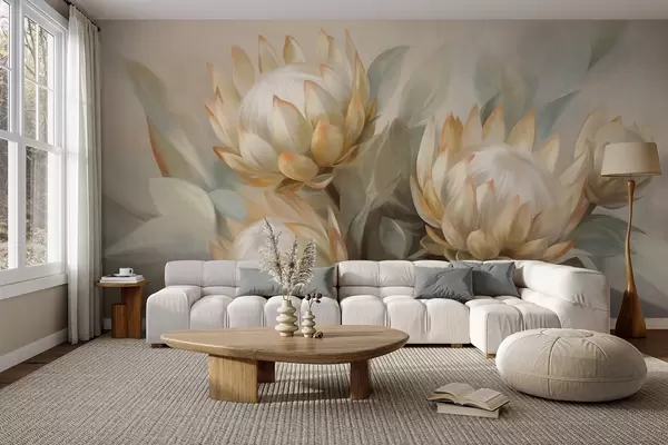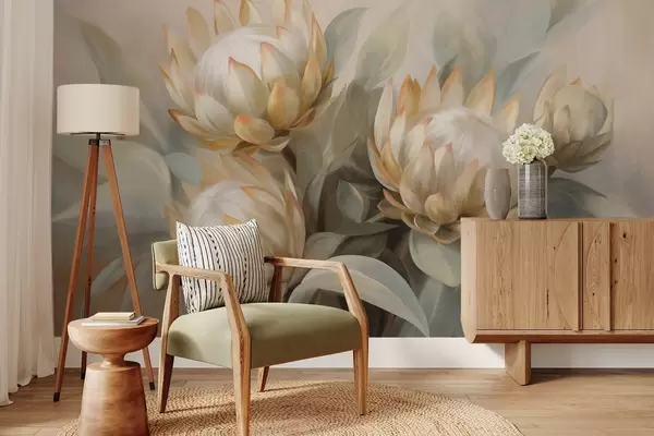Papier peint Fleurs de protéa texturées avec des feuilles vertes et un arrière-plan doux et flou N° w09738