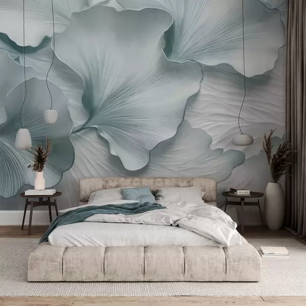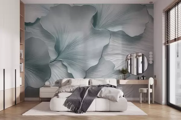 Papier peint Pétales de feuilles de ginkgo texturées, bleues et blanches, avec un imprimé organique délicat N° w09741v1