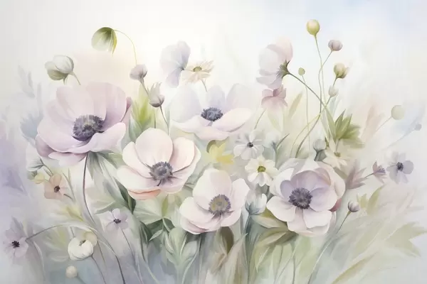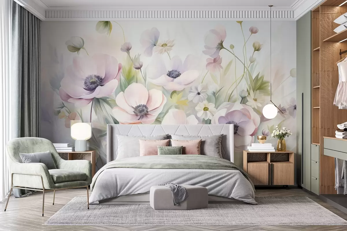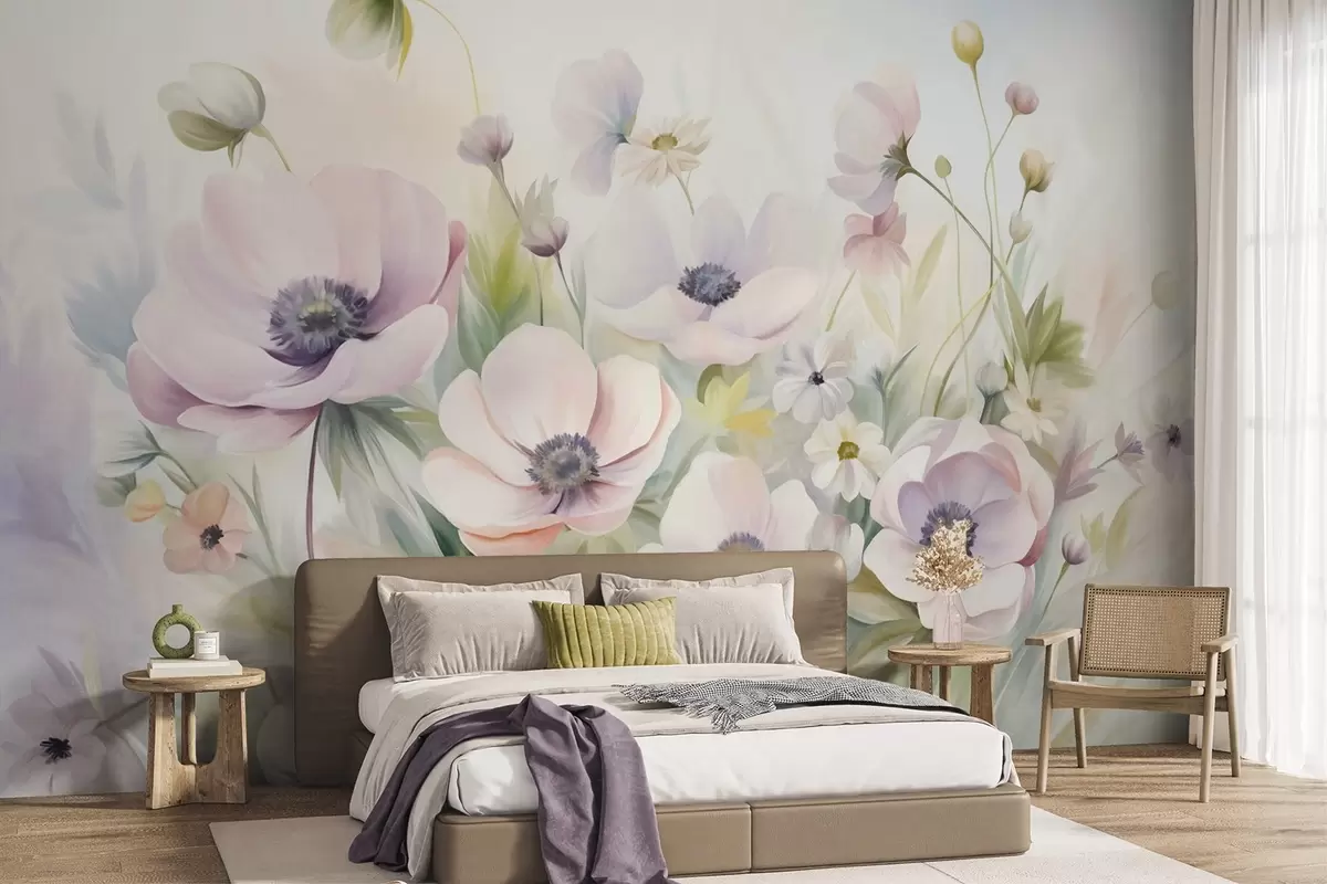 Papier peint Un champ d'anémones roses pastel et blanches, de feuillage vert et de petites marguerites blanches. N° w09742