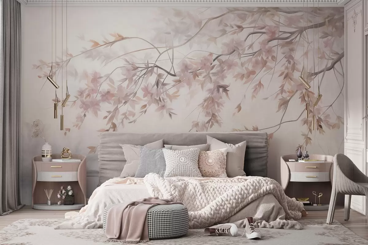 Papier peint Paysage texturé avec branche de cerisier en fleurs, feuilles roses, arrière-plan doux et brumeux N° w09743