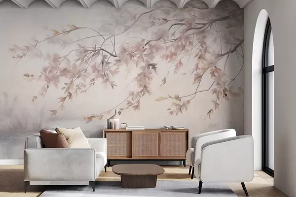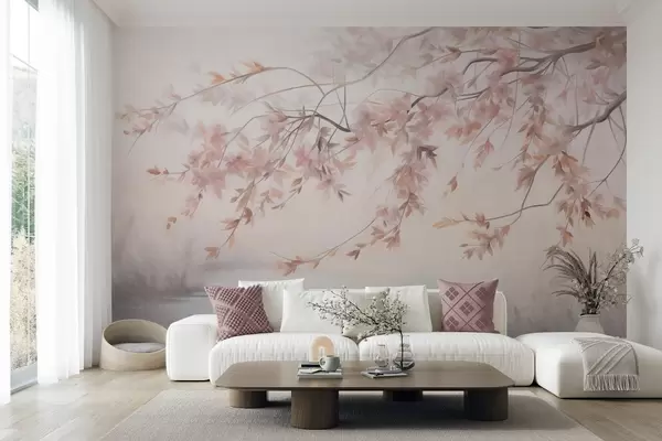 Papier peint Paysage texturé avec branche de cerisier en fleurs, feuilles roses, arrière-plan doux et brumeux N° w09743
