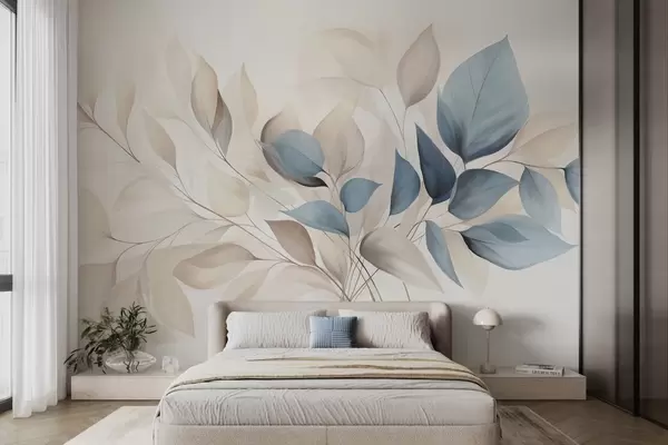 Papier peint Feuilles abstraites translucides dans des tons de bleu, beige et crème, art texturé N° w09744