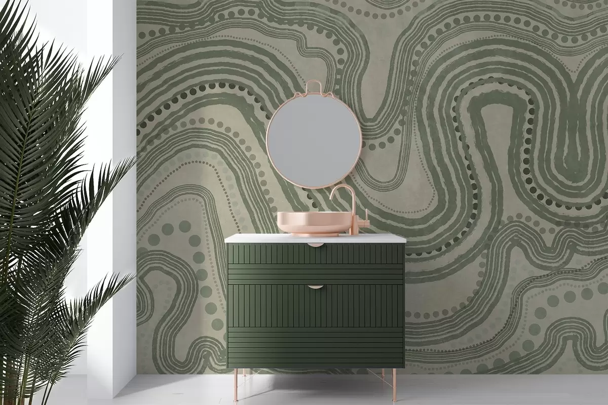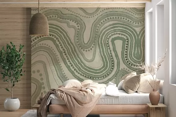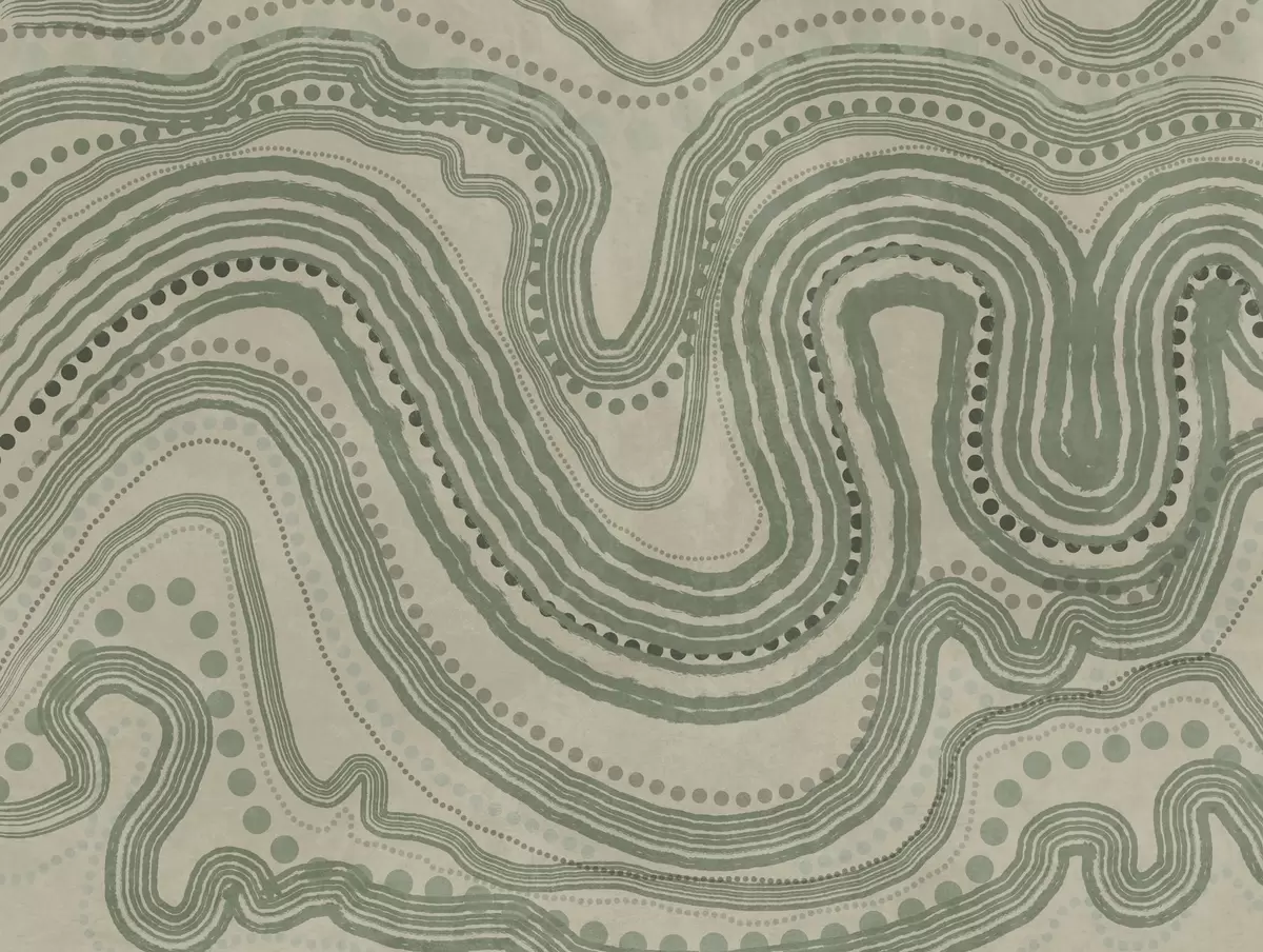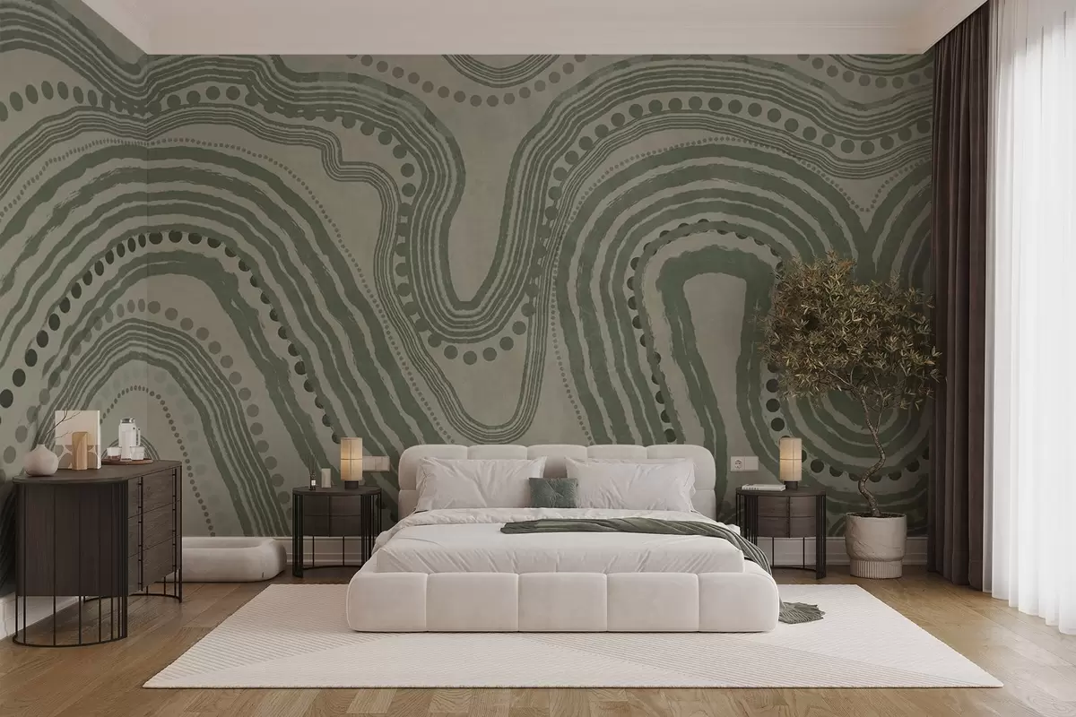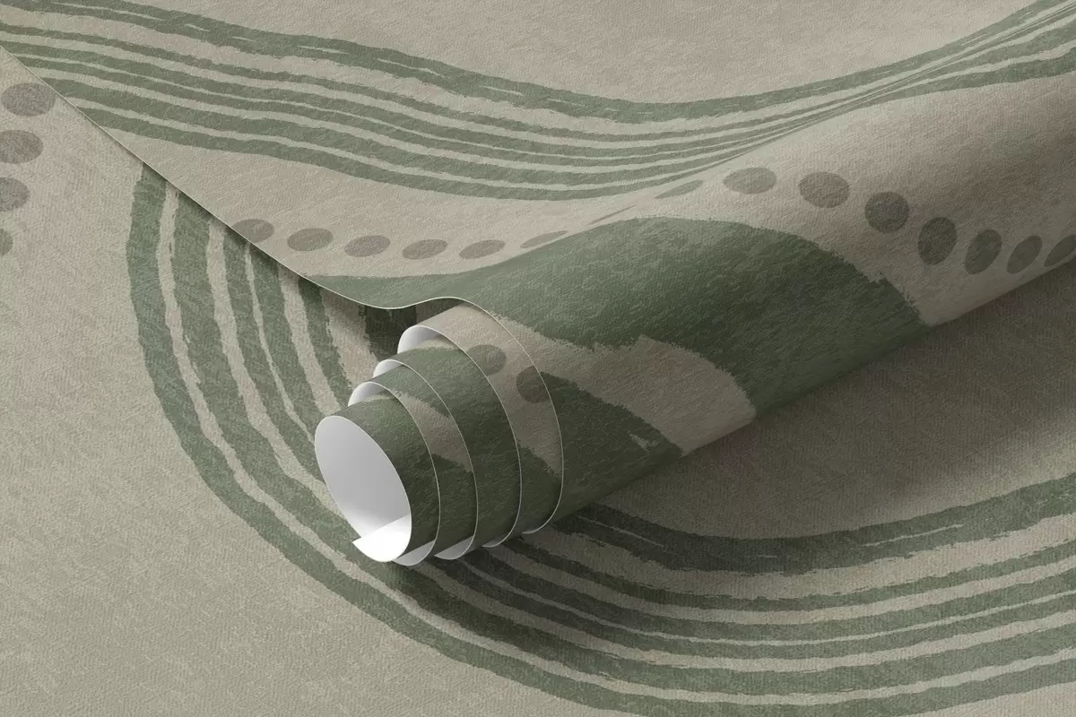 Papier peint Lignes ondulées et points abstraits verts et beiges, art moderne texturé N° w09747