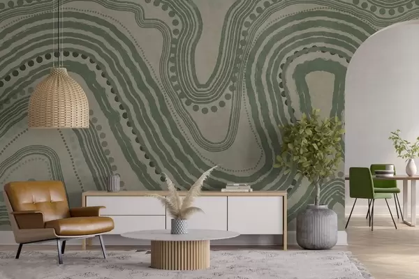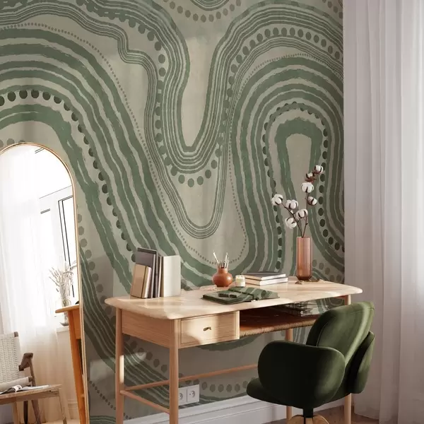 Papier peint Lignes ondulées et points abstraits verts et beiges, art moderne texturé N° w09747