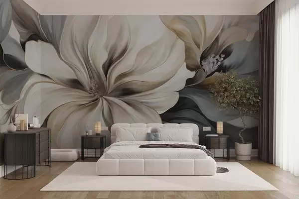 Papier peint Grandes fleurs de magnolia crémeuses avec des feuilles brunes et grises, éclairage doux, arrière-plan abstrait N° w09749