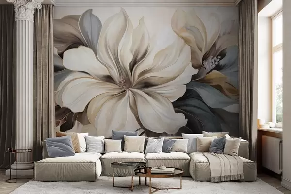 Papier peint Grandes fleurs de magnolia crémeuses avec des feuilles brunes et grises, éclairage doux, arrière-plan abstrait N° w09749