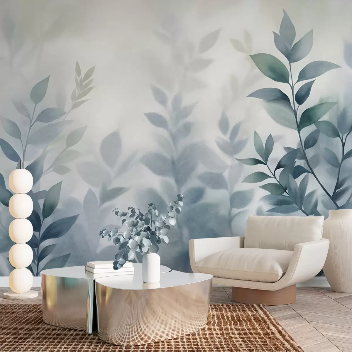 Papier peint Branches délicates aux feuilles bleu pâle, style aquarelle, art texturé N° w09750v1