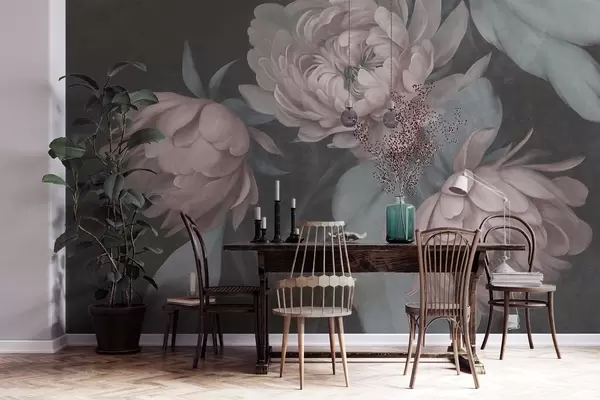 Papier peint Des fleurs de pivoine rose pâle aux textures variées, accompagnées de feuilles vert pâle, sur un fond sombre N° w09751v1